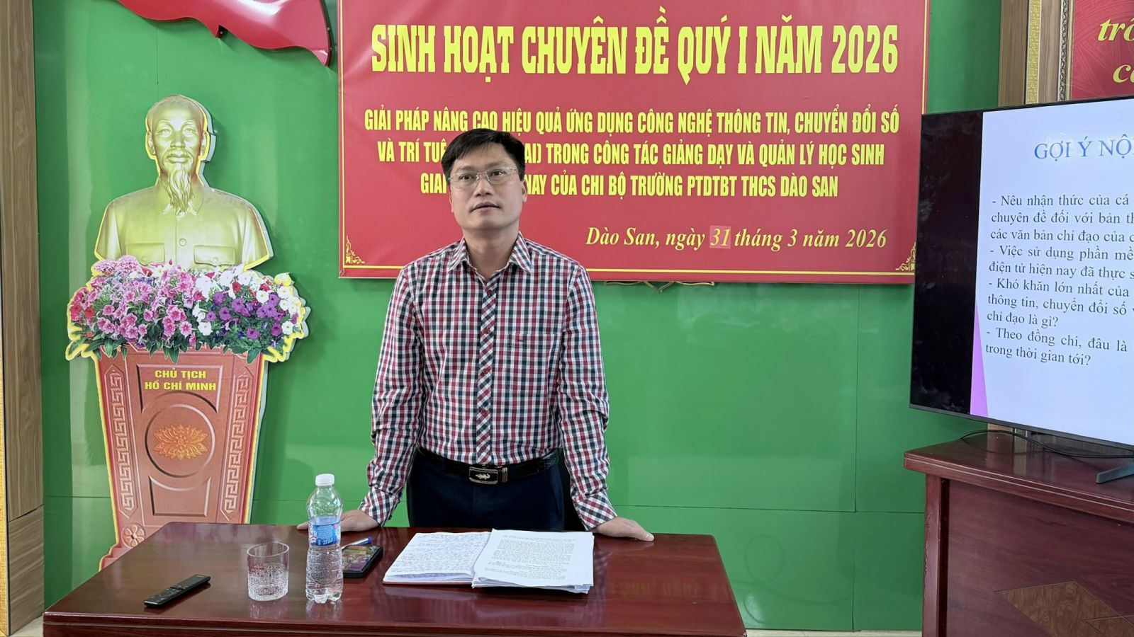 Thực hiện hướng dẫn số 04-HD/TU ngày 04/12/2025 của Ban Thường vụ Tỉnh ủy Lai Châu về nội dung sinh hoạt chi bộ; Căn cứ Kế hoạch số 69-KH/ĐU, ngày 12/01/2026 của Đảng ủy xã Dào San kế hoạch sinh hoạt chi bộ mẫu năm 2026. Chiều 31/03 Chi bộ Trường PTDTB THCS Dào San đã tổ chức sinh hoạt chuyên đề quý I năm 2026. Buổi sinh hoạt với chuyên đề: “Giải pháp nâng cao hiệu quả ứng dụng công nghệ thông tin, chuyển đổi số và trí tuệ nhân tạo trong công tác giảng dạy và quản lý học sinh giai đoạn hiện nay”. Dự và chỉ đạo có đồng chí Trương Xuân Việt – Phó Bí thư Thường trực Đảng ủy xã Dào San. Tham dự còn có đại diện lãnh đạo UBND xã, Ủy ban MTTQ Việt Nam xã, Ban Xây dựng Đảng và bí thư các chi bộ trực thuộc Đảng bộ xã. Về phía nhà trường có đồng chí Mai Văn Tường – Bí thư Chi bộ, Hiệu trưởng nhà trường cùng toàn thể đảng viên trong chi bộ.