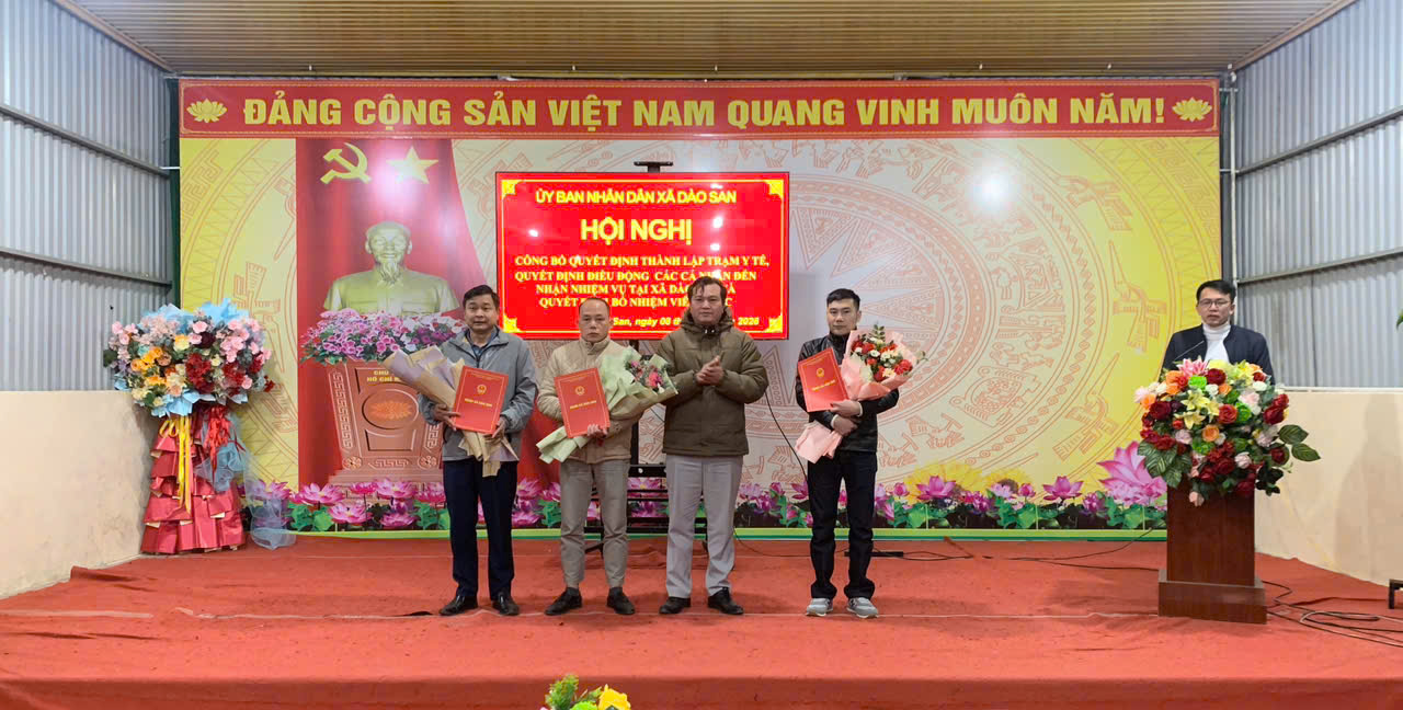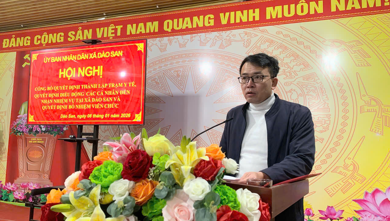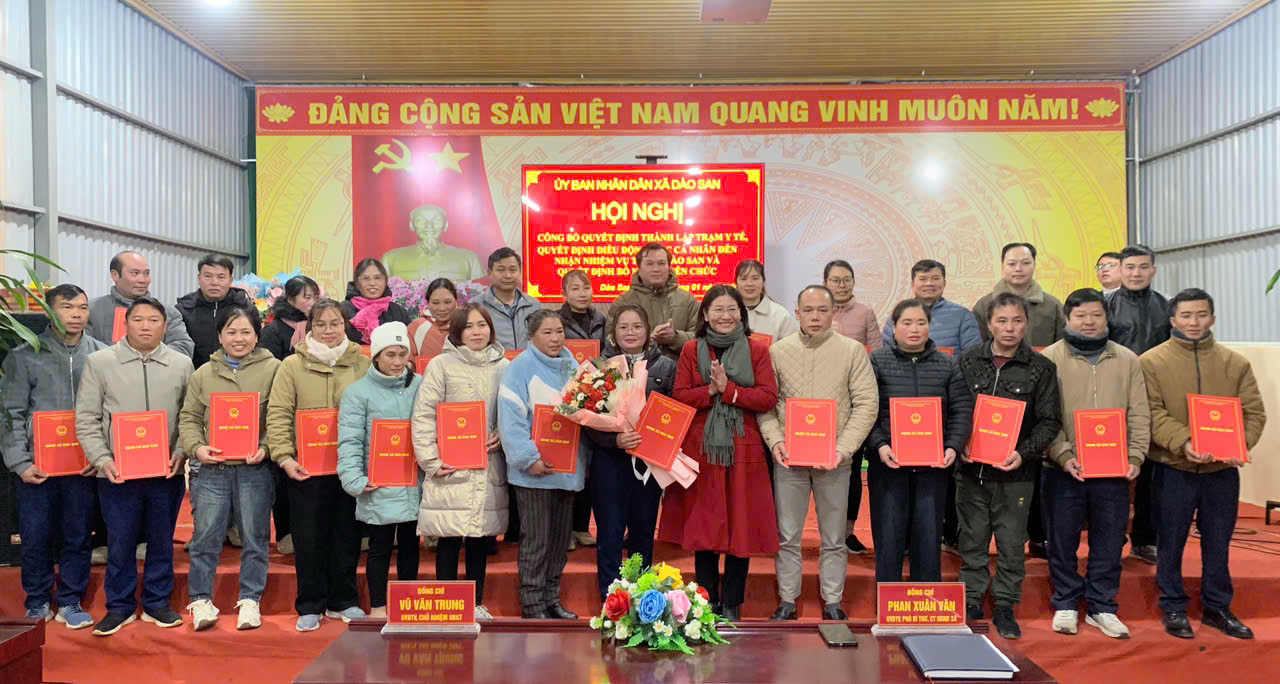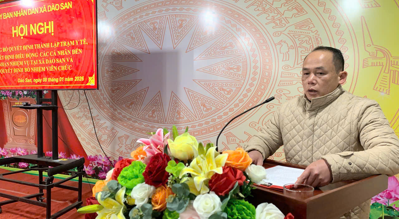 Chiều ngày 08/01/2026, Ủy ban nhân dân xã Dào San tổ chức Hội nghị công bố Quyết định thành lập Trạm Y tế xã Dào San và các Quyết định điều động cán bộ, viên chức và bổ nhiệm lãnh đạo Trạm Y tế xã. Đây là sự kiện có ý nghĩa quan trọng, đánh dấu bước kiện toàn tổ chức bộ máy đơn vị sự nghiệp công lập trên địa bàn xã, góp phần nâng cao hiệu lực, hiệu quả quản lý nhà nước trong lĩnh vực y tế, đáp ứng yêu cầu đổi mới, sắp xếp tổ chức theo hướng tinh gọn, hoạt động hiệu quả. Dự Hội nghị có đồng chí Phan Xuân Văn – Phó Bí thư Đảng ủy, Chủ tịch UBND xã; các đồng chí trong Ban Thường vụ Đảng ủy; Thường trực HĐND, UBND xã; đại diện lãnh đạo các phòng ban, chuyên môn xã cùng toàn thể cán bộ, viên chức Trạm Y tế xã Dào San.