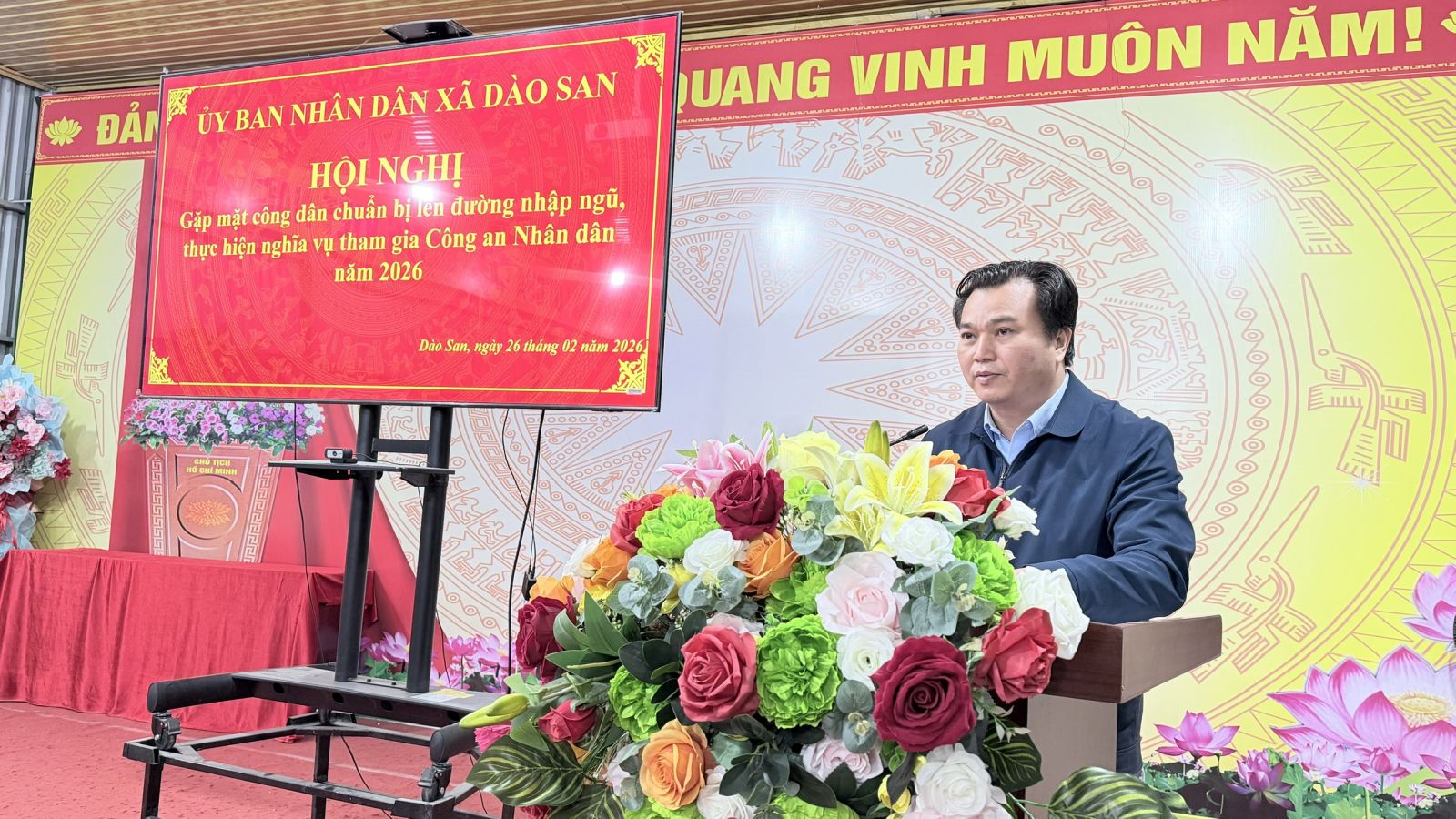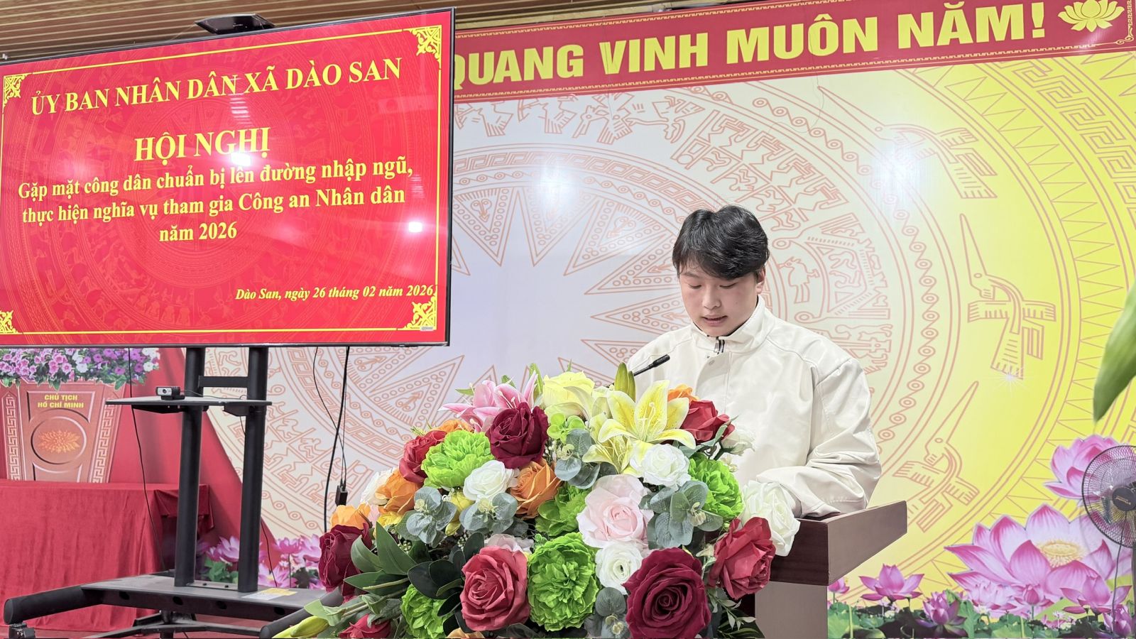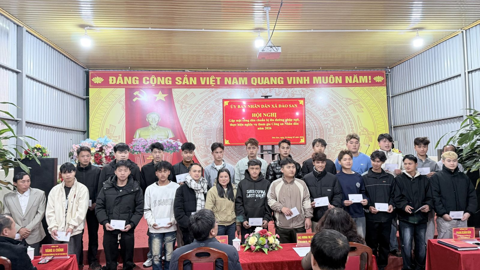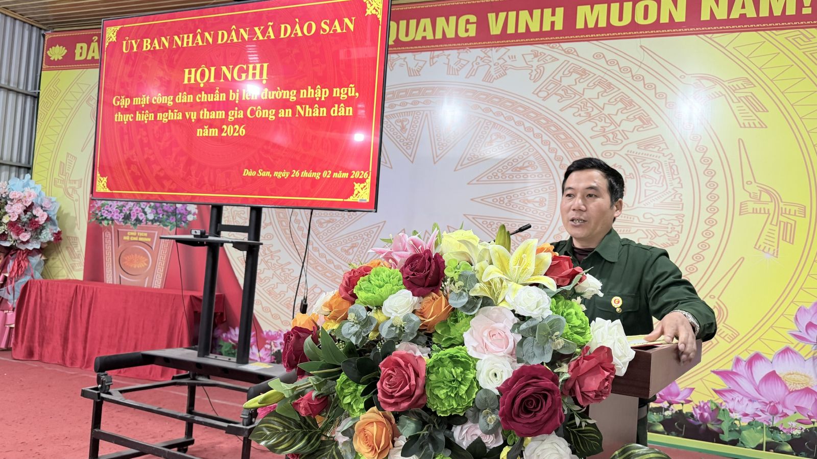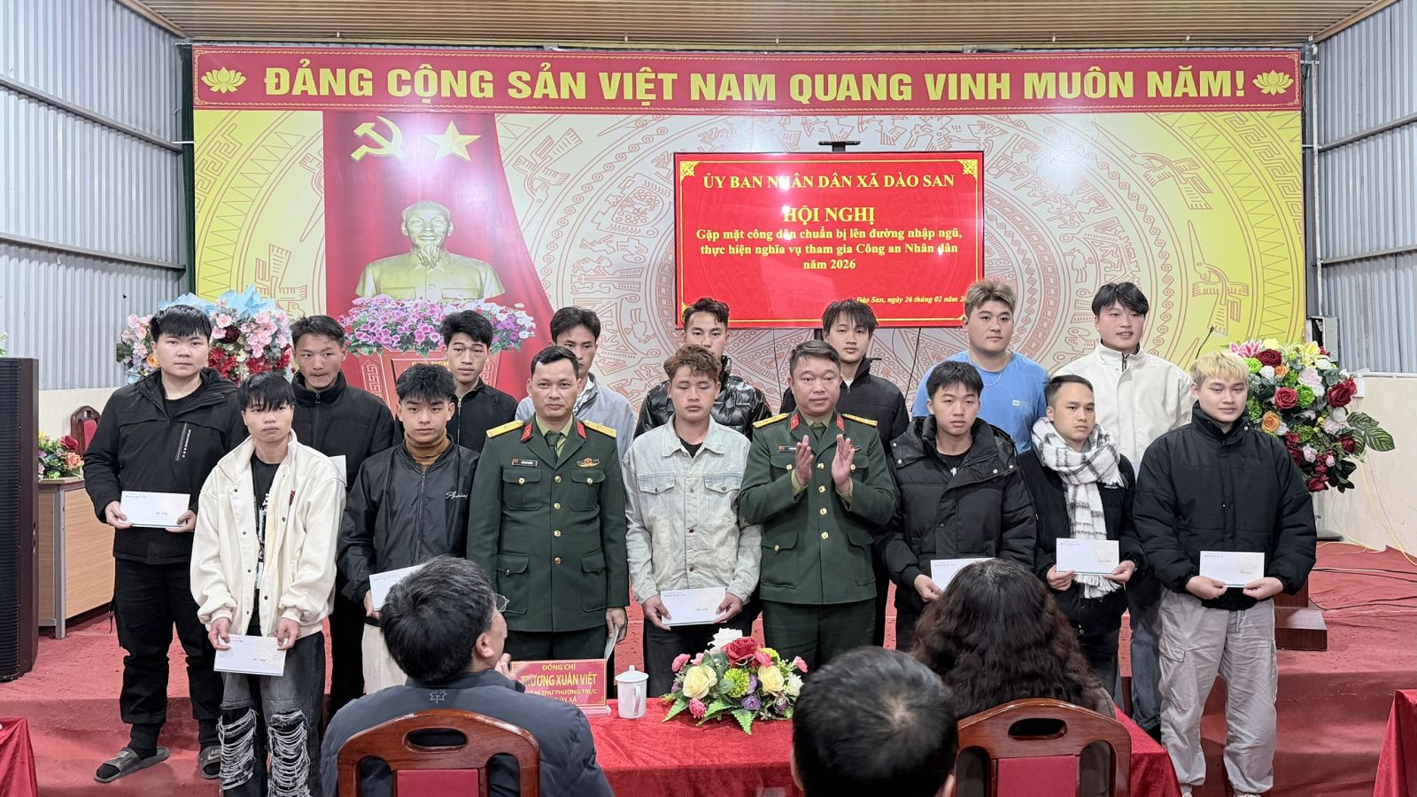 Sáng 26/2/2026, Ủy ban nhân dân xã Dào San tổ chức Hội nghị gặp mặt thanh niên lên đường nhập ngũ và thực hiện nghĩa vụ tham gia Công an nhân dân năm 2026 trong không khí trang trọng, ấm áp và đầy khí thế. Dự hội nghị có đồng chí Vương Thị Thu Hiền – Bí thư Đảng ủy, Chủ tịch HĐND xã; đồng chí Trương Xuân Việt – Phó Bí thư Thường trực Đảng ủy xã; đồng chí Phan Xuân Văn – Phó Bí thư Đảng ủy, Chủ tịch UBND xã. Tham dự còn có các đồng chí bí thư chi bộ, trưởng bản có thanh niên nhập ngũ; đại diện các ban, ngành, đoàn thể; các thanh niên trúng tuyển nghĩa vụ quân sự, nghĩa vụ tham gia Công an nhân dân năm 2026 cùng đông đảo người thân.