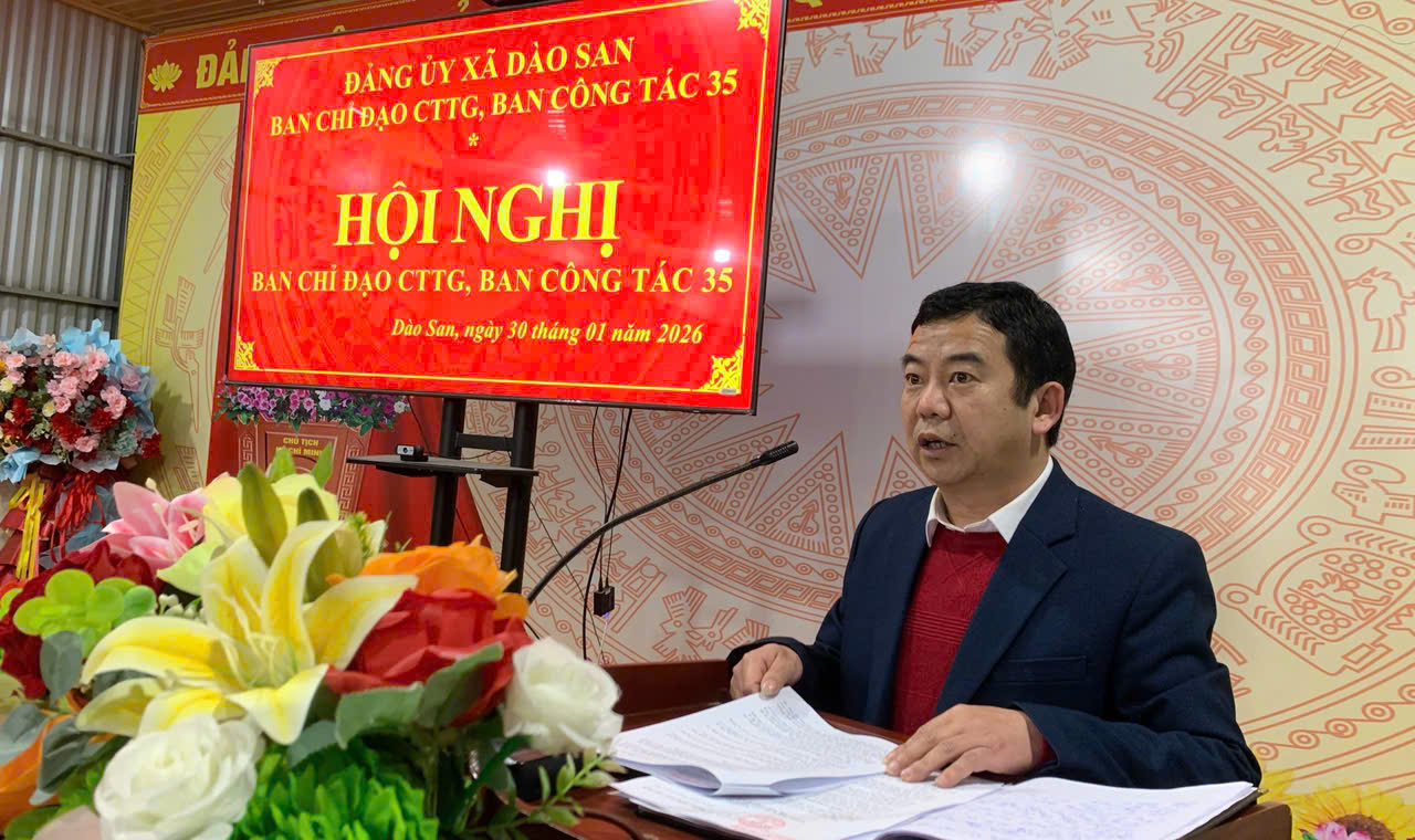 Chiều ngày 30/01/2026, xã Dào San tổ chức Hội nghị công tác tôn giáo và Ban Công tác 35, nhằm đánh giá kết quả thực hiện nhiệm vụ trong năm 2025 và thống nhất phương hướng, nhiệm vụ trọng tâm năm 2026. Dự và chỉ đạo hội nghị có đồng chí Trương Xuân Việt – Phó Bí thư Thường trực Đảng ủy xã; đại diện lãnh đạo HĐND, UBND xã; các thành viên Ban Chỉ đạo công tác tôn giáo, Ban Công tác 35; đại diện Đồn Biên phòng Dào San, Đoàn Kinh tế – Quốc phòng 356 cùng đội ngũ người có uy tín tại 28 bản trên địa bàn xã.